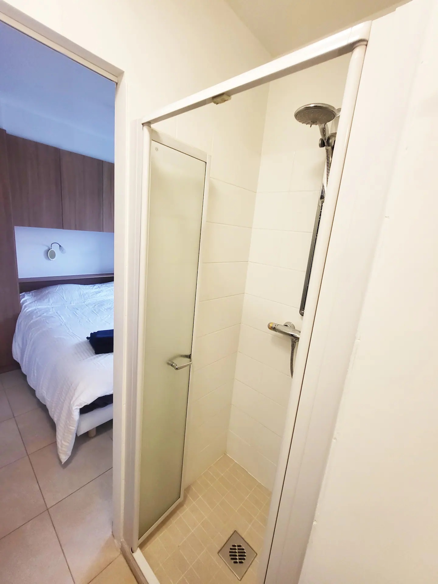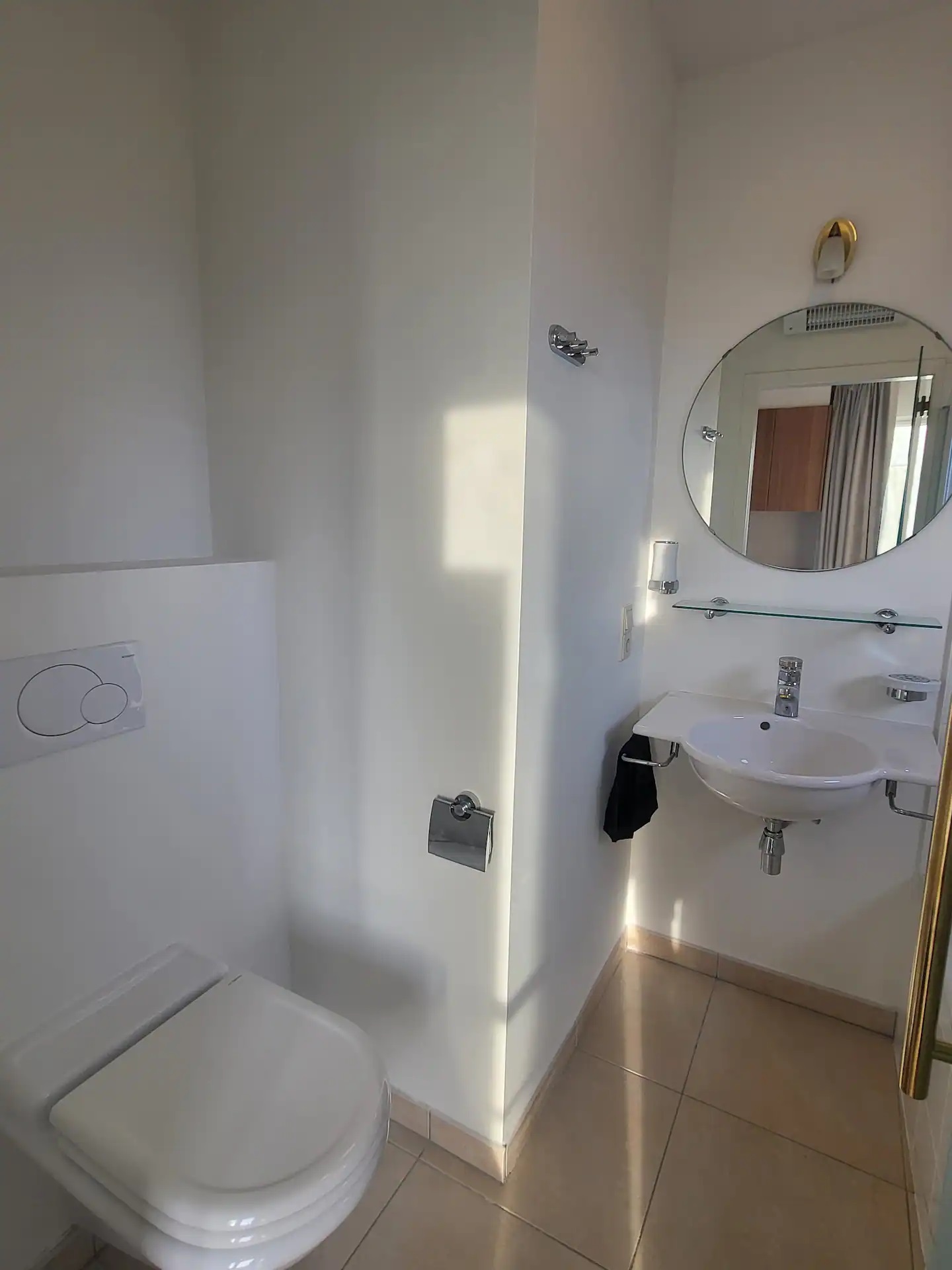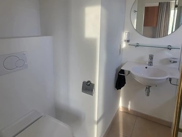 The first bedroom has a bed, storage and a bathroom with a toilet and a big bath to relax and enjoy your holidays.